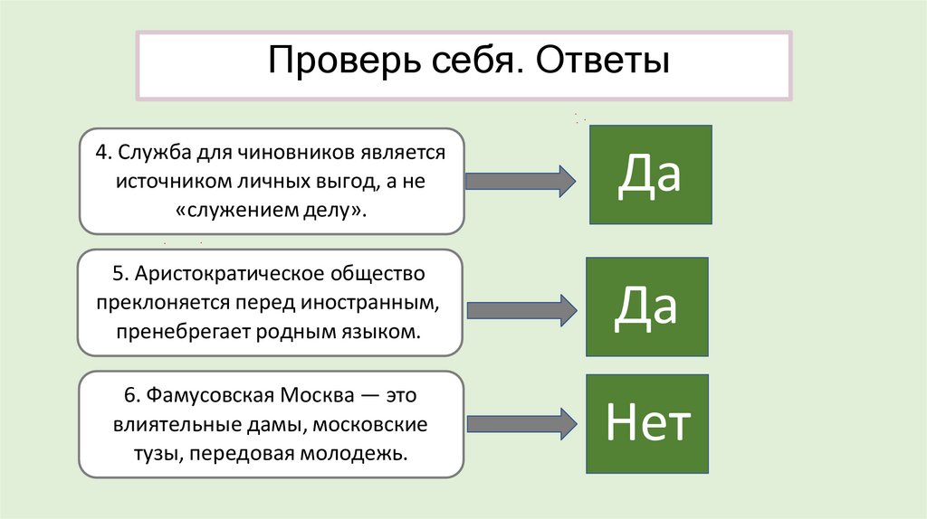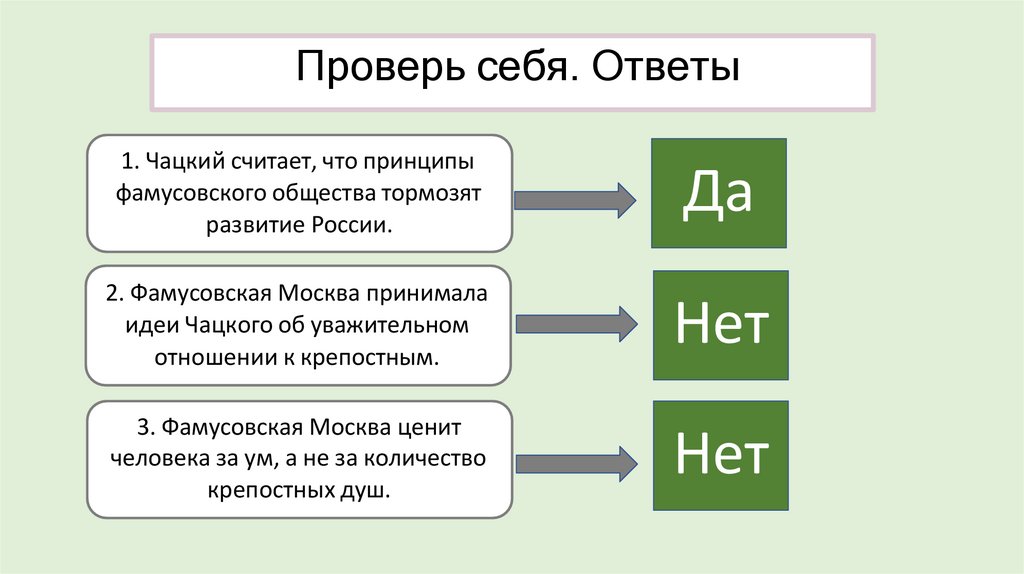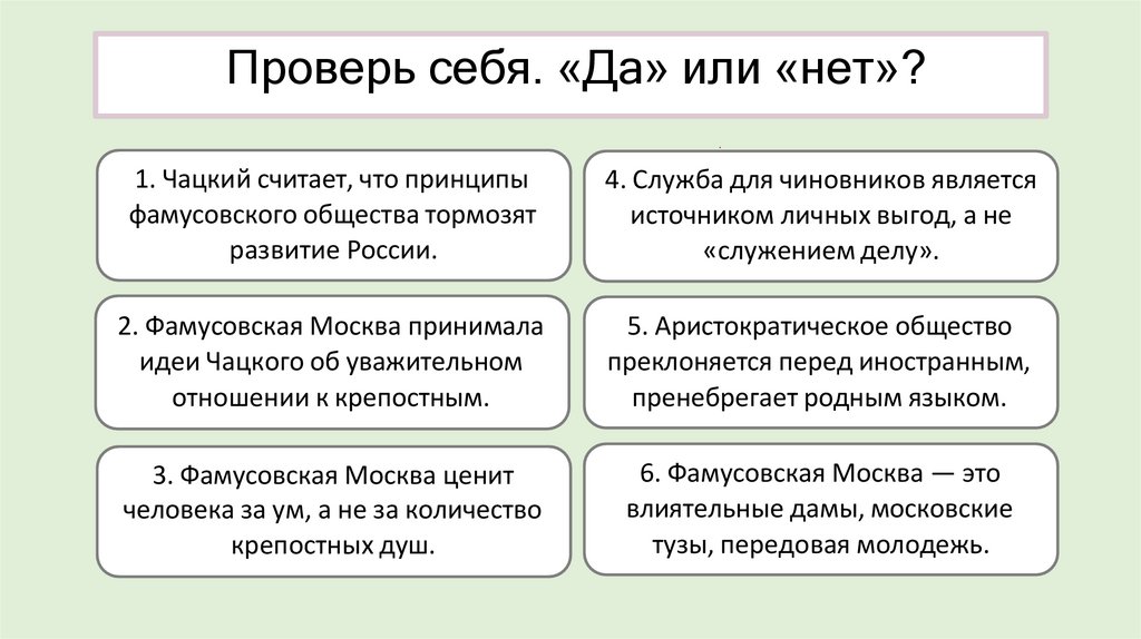 Проверь себя. «Да» или «нет»?1. Чацкий считает, что принципы