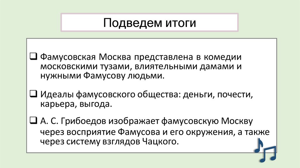 Подведем итогиФамусовская Москва представлена в комедии