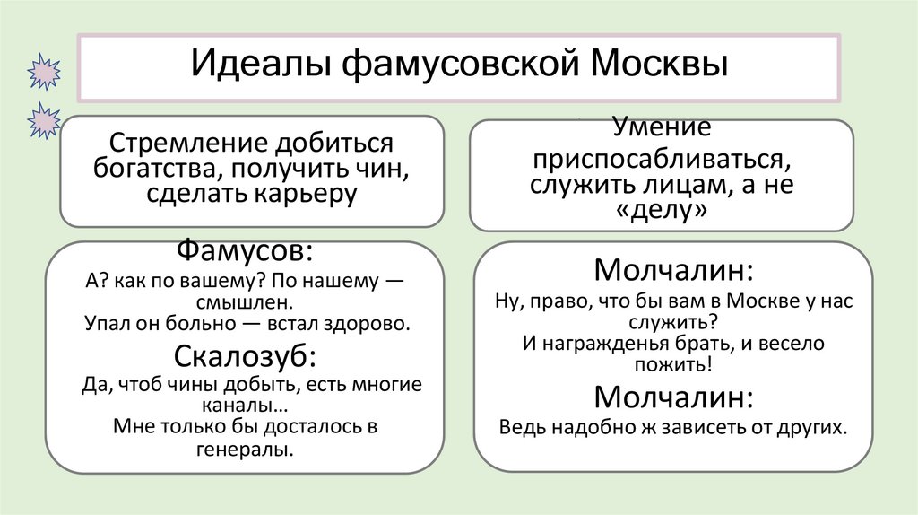 Идеалы фамусовского общества: деньги, почести,