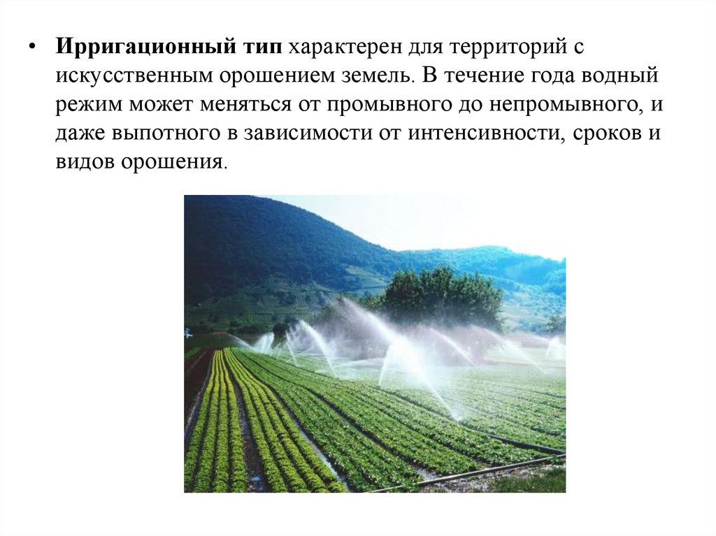 • Ирригационный тип характерен для территорий сискусственным орошением земель. В течение года водный