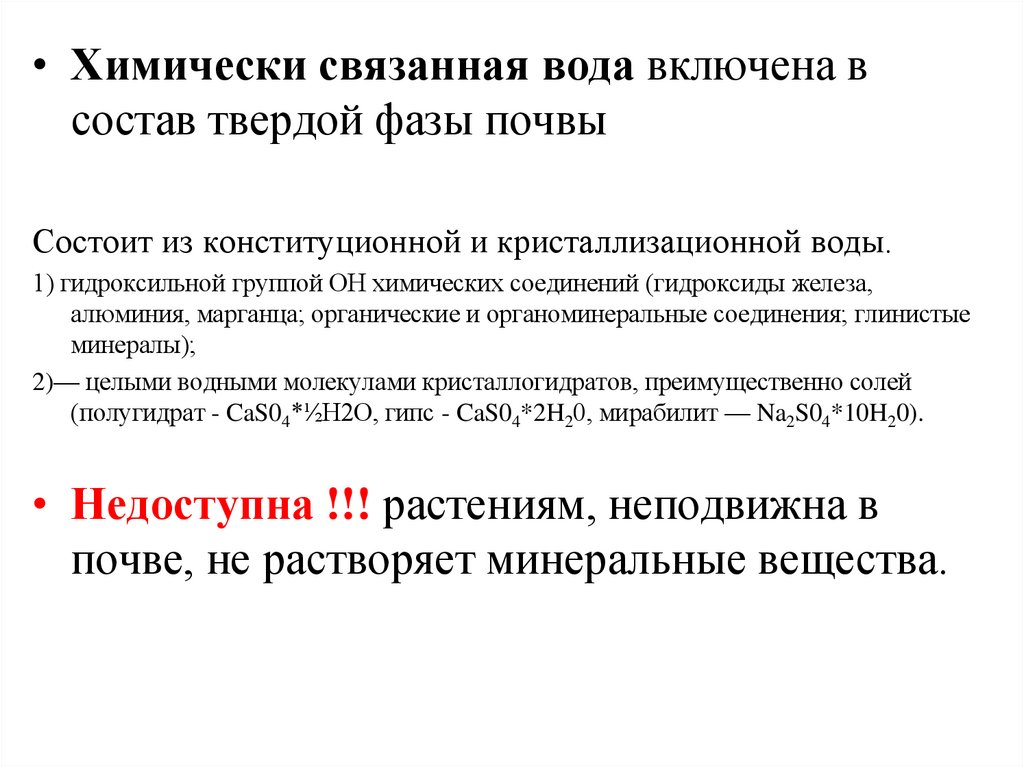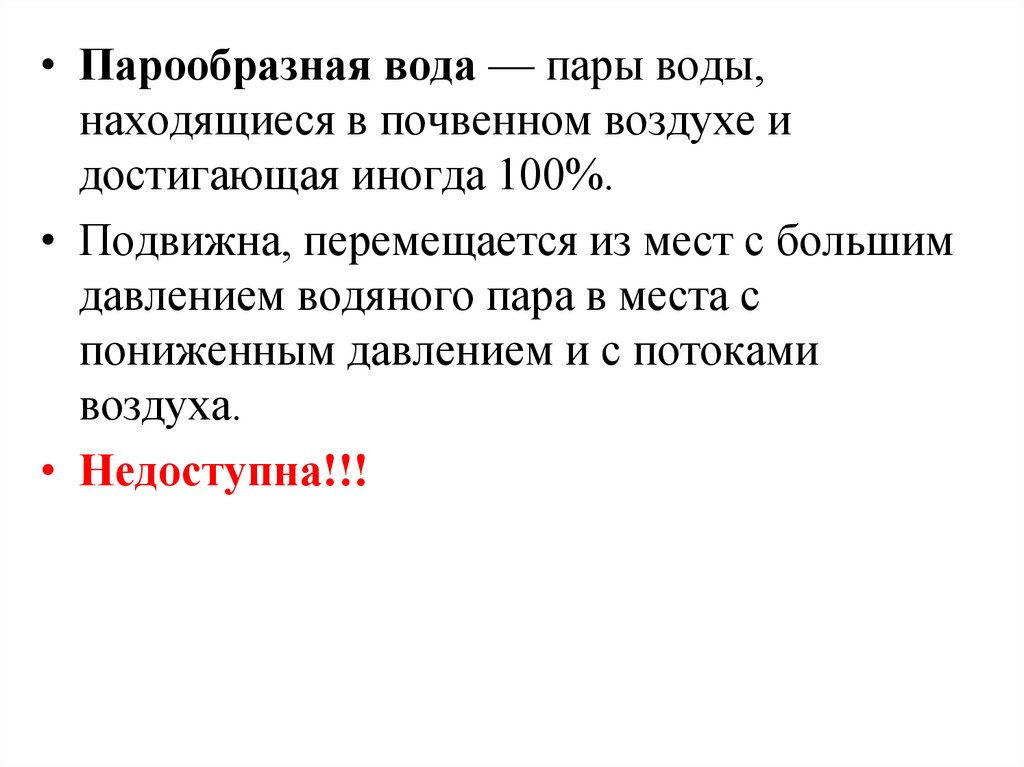 • Парообразная вода — пары воды,находящиеся в почвенном воздухе и