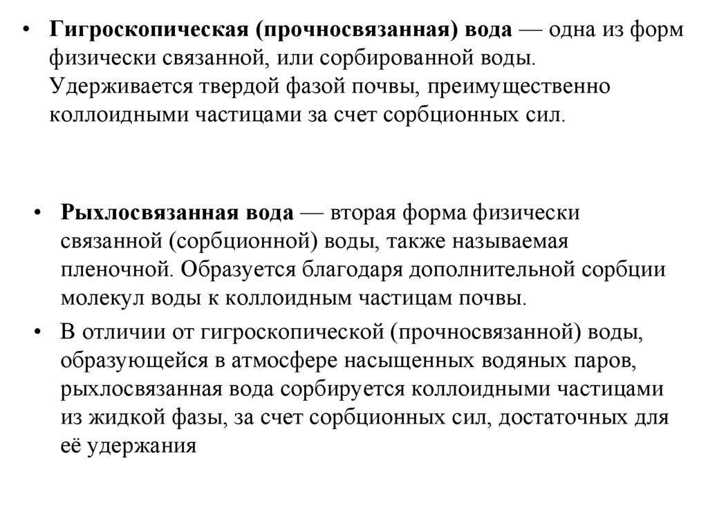 • Гигроскопическая (прочносвязанная) вода — одна из формфизически связанной, или сорбированной воды.