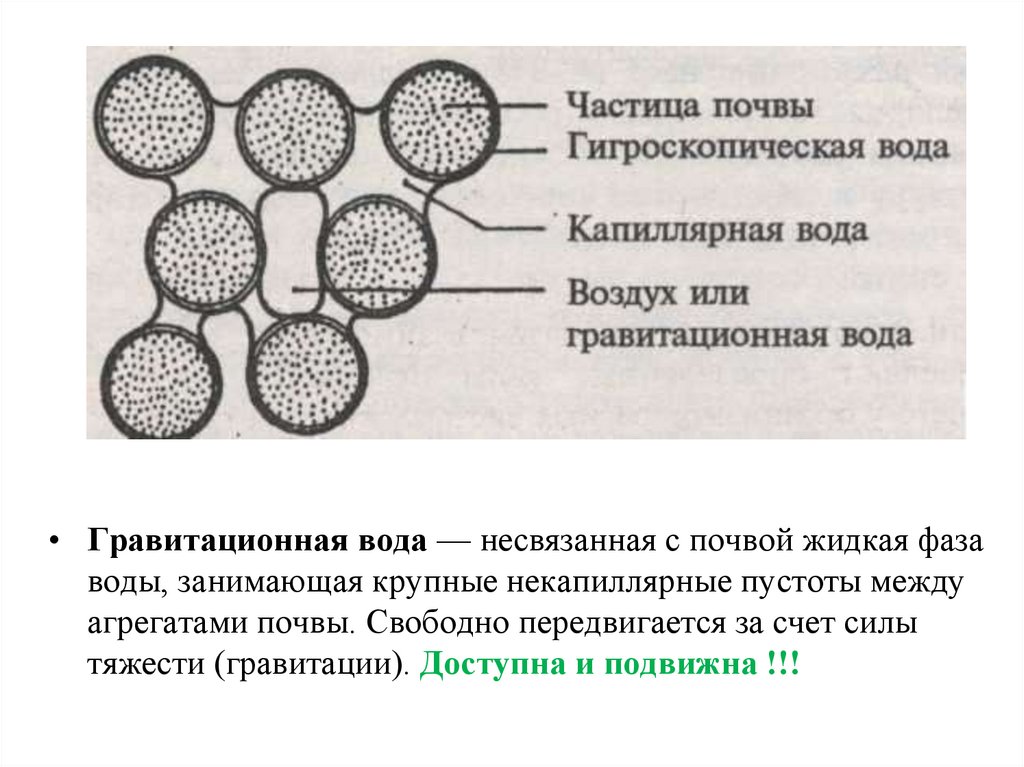 • Гравитационная вода — несвязанная с почвой жидкая фазаводы, занимающая крупные некапиллярные пустоты между