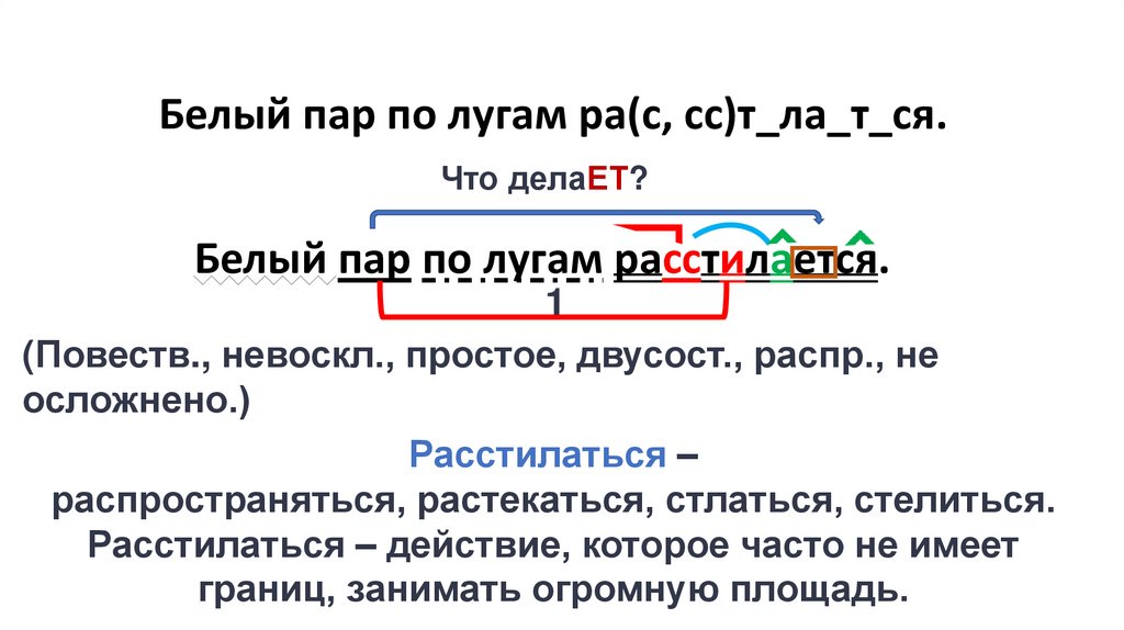 Белый пар по лугам ра(с, сс)т_ла_т_ся.Что делаЕТ?