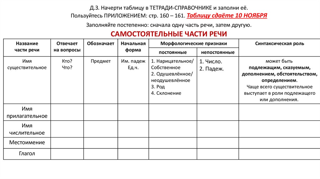 Д.З. Начерти таблицу в ТЕТРАДИ-СПРАВОЧНИКЕ и заполни её.Пользуйтесь ПРИЛОЖЕНИЕМ: стр. 160 – 161. Таблицу сдаёте 10 НОЯБРЯ