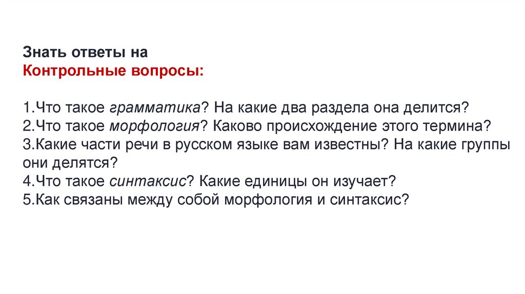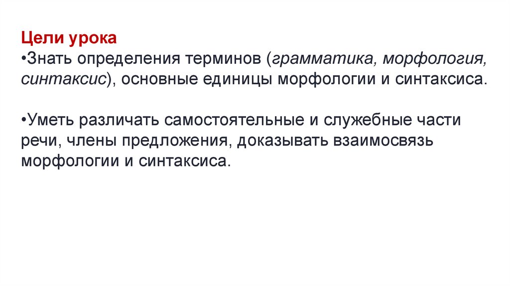 Цели урока•Знать определения терминов (грамматика, морфология,