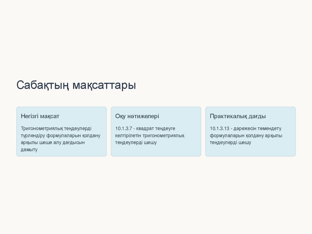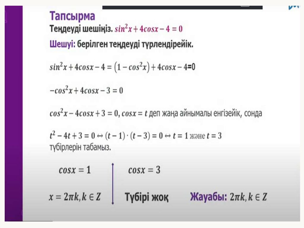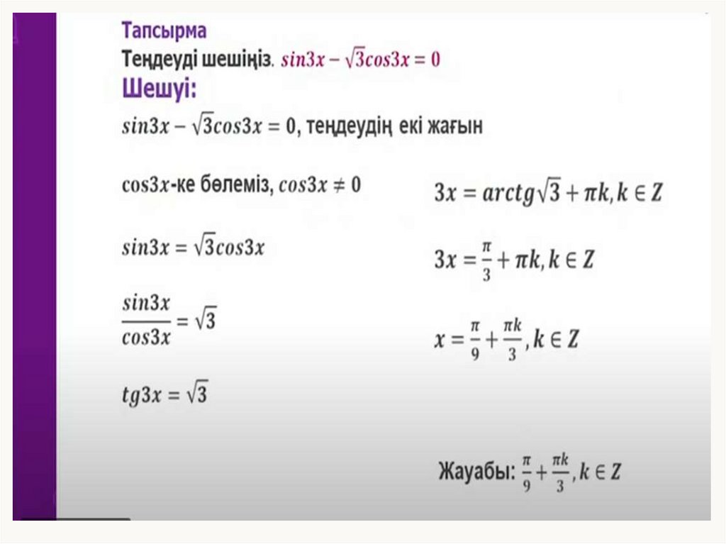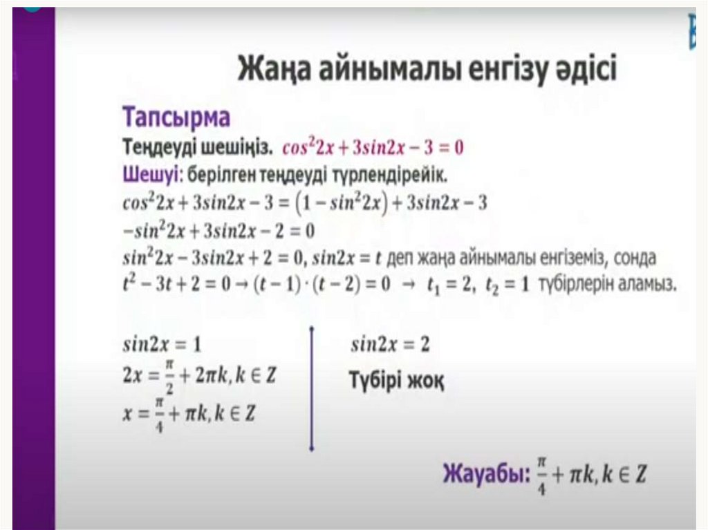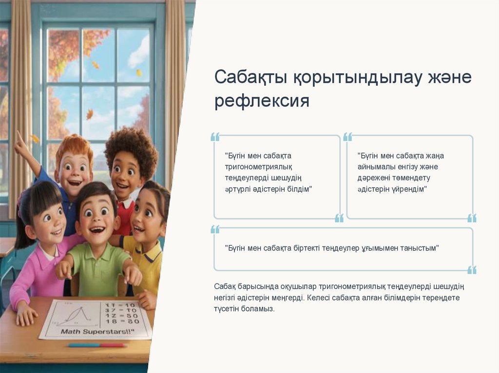 Сабақ барысында оқушылар тригонометриялық теңдеулерді шешудің
