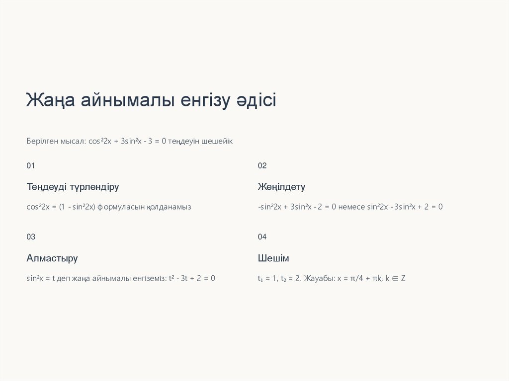 Жаңа айнымалы енгізу әдісіБерілген мысал: cos ²2x + 3sin²x - 3 = 0 теңдеуін шешейік