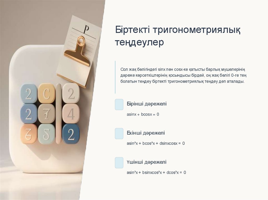 болатын теңдеу біртекті тригонометриялық теңдеу деп аталады.