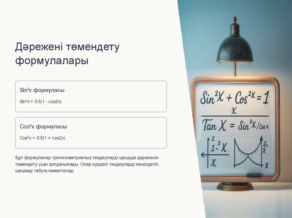 Бұл формулалар тригонометриялық теңдеулерді шешуде дәрежесін