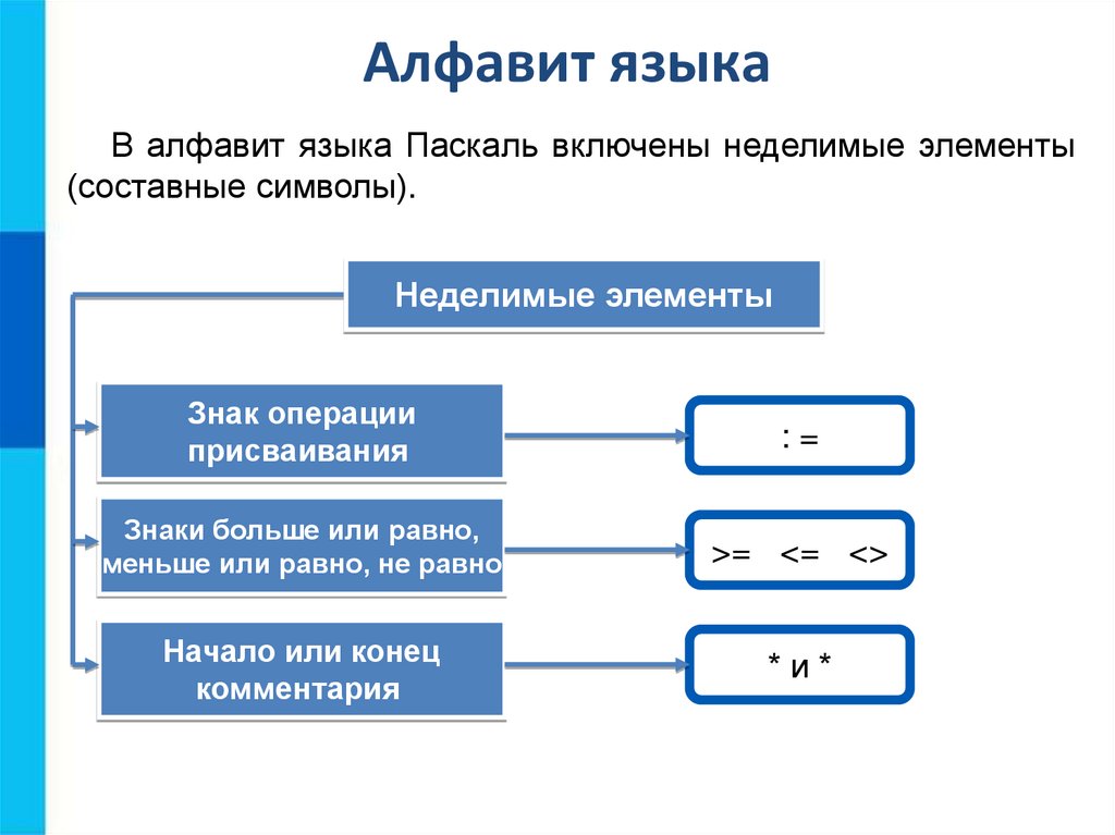 Алфавит языкаВ алфавит языка Паскаль включены неделимые элементы