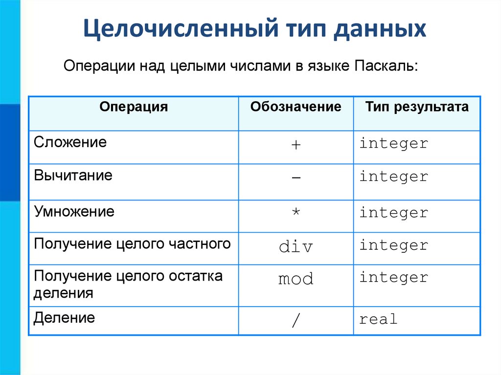 Целочисленный тип данныхОперации над целыми числами в языке Паскаль: