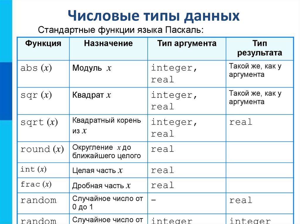 Числовые типы данныхСтандартные функции языка Паскаль: