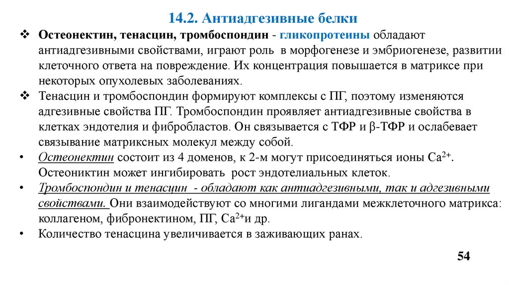 14.2. Антиадгезивные белкиОстеонектин, тенасцин, тромбоспондин - гликопротеины обладают