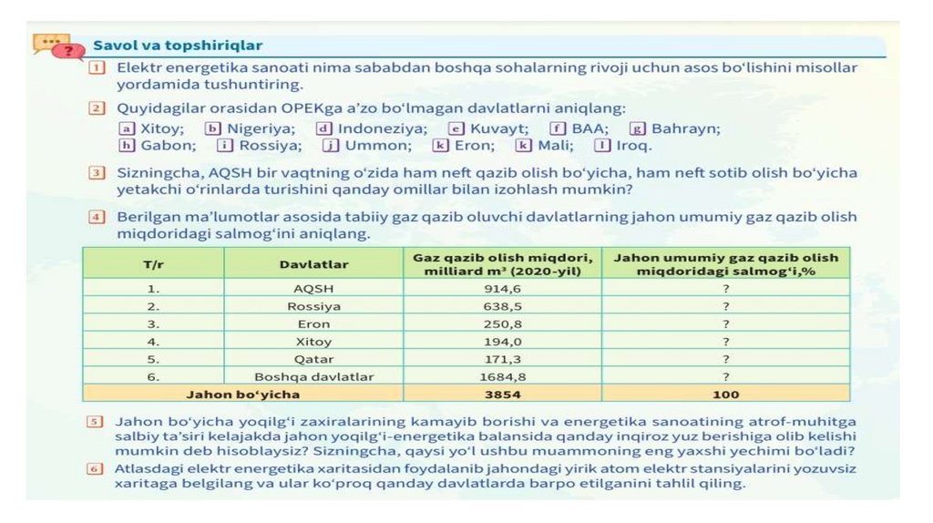 13. Mazkur davlatlar hissasiga jami qazib olingan neftning 53% iga yaqin qismi to‘g‘ri kelgan. Saudiya Arabistoni, Rossiya, BAA,