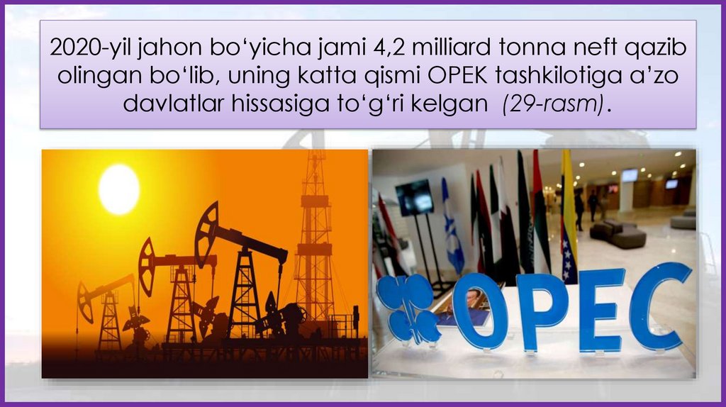 2020-yil jahon bo‘yicha jami 4,2 milliard tonna neft qazibolingan bo‘lib, uning katta qismi OPEK tashkilotiga a’zo