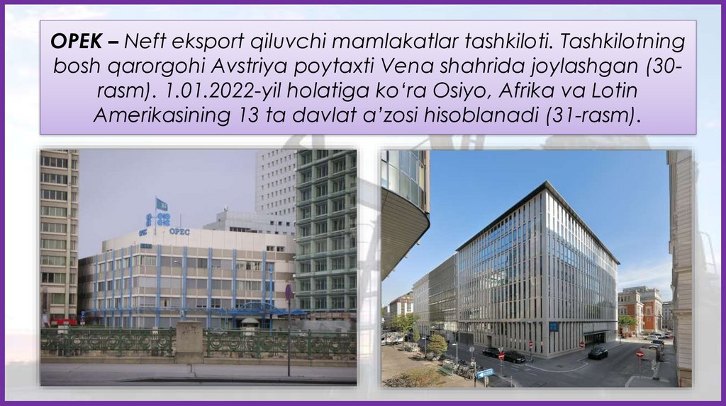 OPEK – Neft eksport qiluvchi mamlakatlar tashkiloti. Tashkilotningbosh qarorgohi Avstriya poytaxti Vena shahrida joylashgan (30rasm). 1.01.2022-yil holatiga ko‘ra Osiyo, Afrika va Lotin