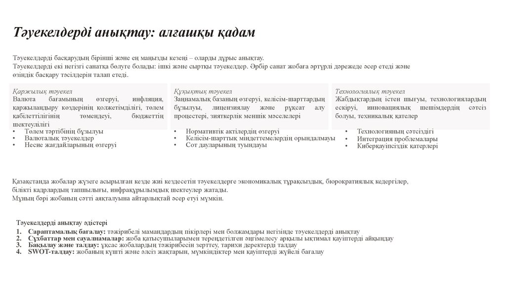Барлық ықтимал тәуекелдерді жүйелі түрде анықтау: ішкі және сыртқы, стратегиялық және операциялық