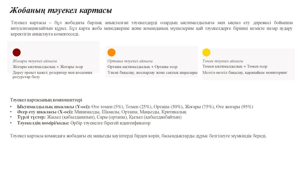 Жобаның тәуекел картасыТәуекел картасы – бұл жобадағы барлық анықталған тәуекелдерді олардың ықтималдылығы мен ықпал ету дәрежесі бойынша