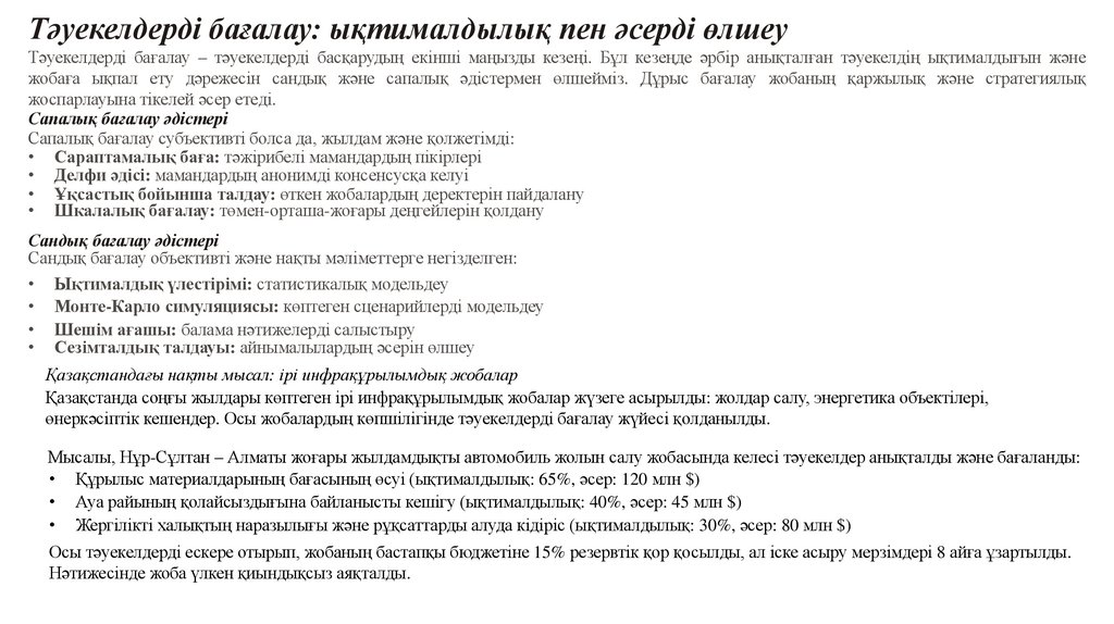 Мысалы, Нұр-Сұлтан – Алматы жоғары жылдамдықты автомобиль жолын салу жобасында келесі тәуекелдер анықталды және бағаланды: