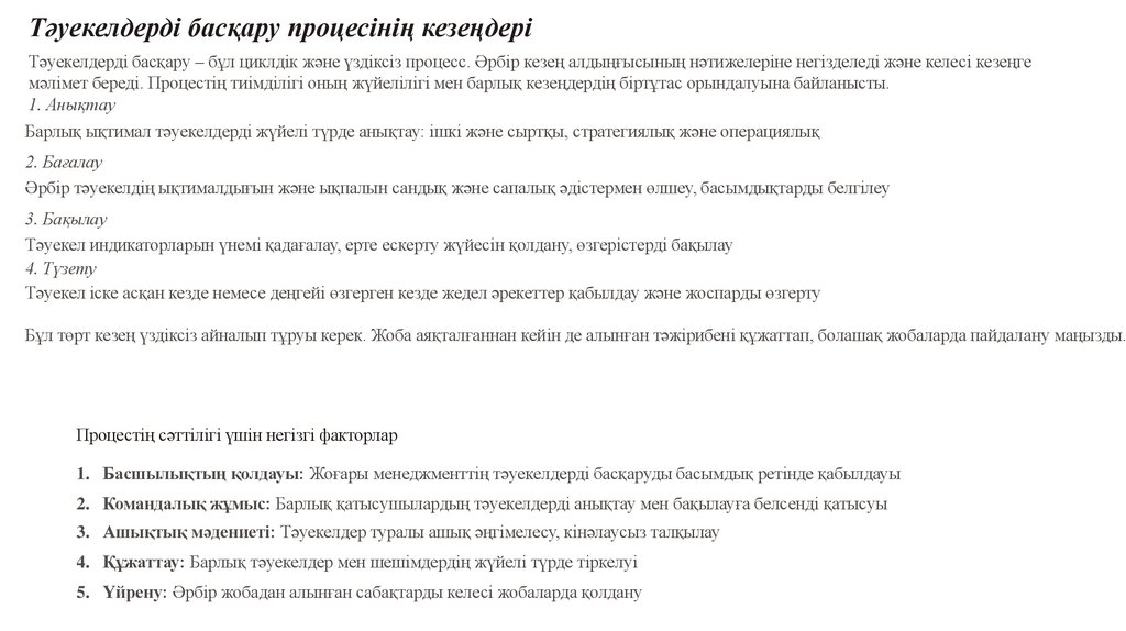 Тәуекелдерді басқару процесінің кезеңдеріТәуекелдерді басқару – бұл циклдік және үздіксіз процесс. Әрбір кезең алдыңғысының нәтижелеріне негізделеді және келесі кезеңге