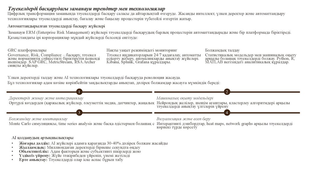 Тәуекелдерді басқарудағы заманауи трендтер мен технологияларЦифрлық трансформация заманында тәуекелдерді басқару саласы да айтарлықтай өзгеруде. Жасанды интеллект, үлкен деректер және автоматтандыру