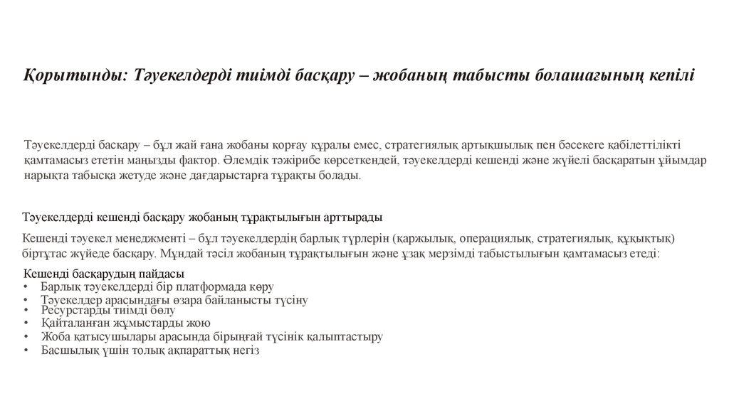 Қорытынды: Тәуекелдерді тиімді басқару – жобаның табысты болашағының кепіліТәуекелдерді басқару – бұл жай ғана жобаны қорғау құралы емес, стратегиялық артықшылық пен бәсекеге қабілеттілікті