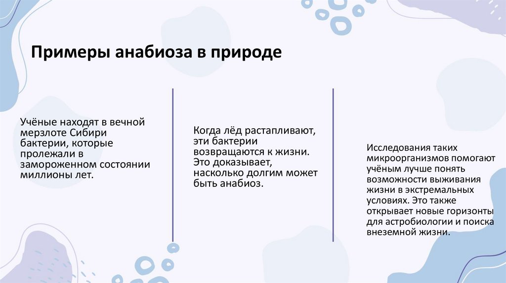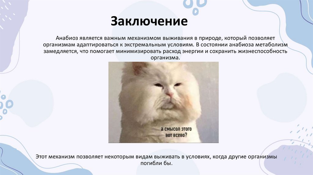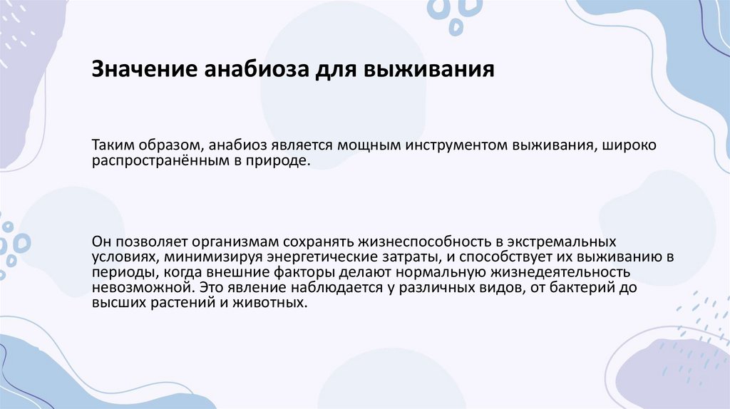 ЗаключениеАнабиоз является важным механизмом выживания в природе, который позволяет