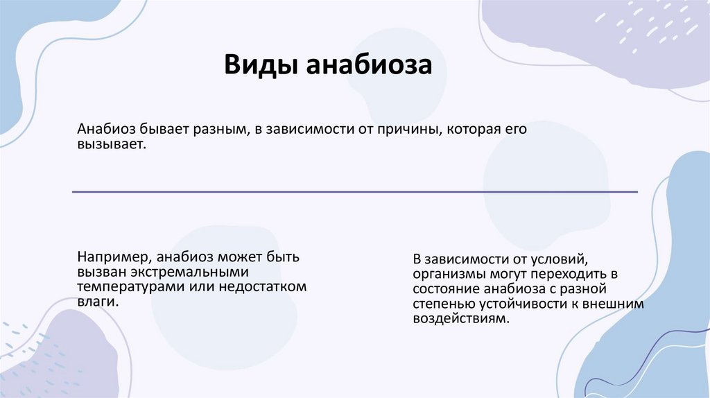 Виды анабиозаАнабиоз бывает разным, в зависимости от причины, которая его