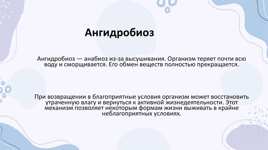 АнгидробиозАнгидробиоз — анабиоз из-за высушивания. Организм теряет почти всю