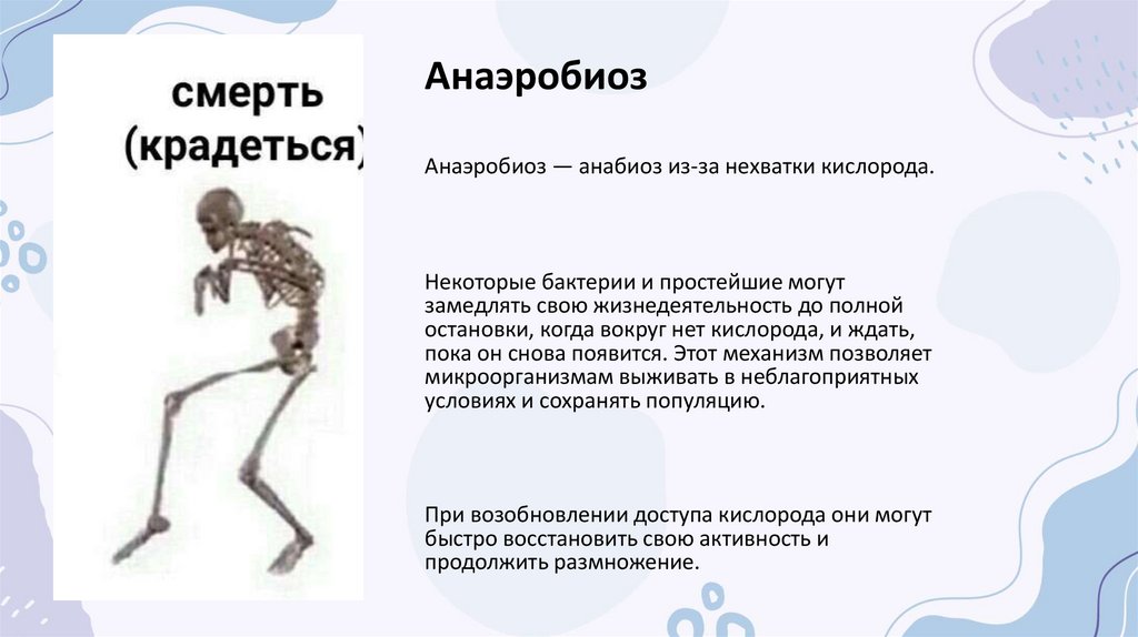 АнаэробиозАнаэробиоз — анабиоз из-за нехватки кислорода.