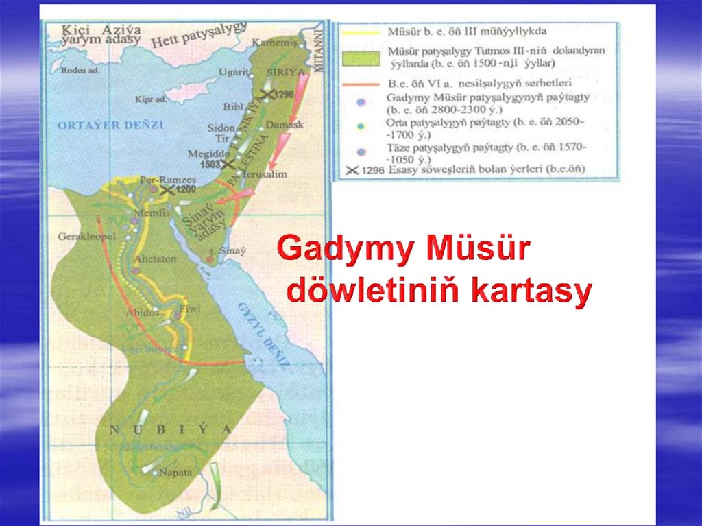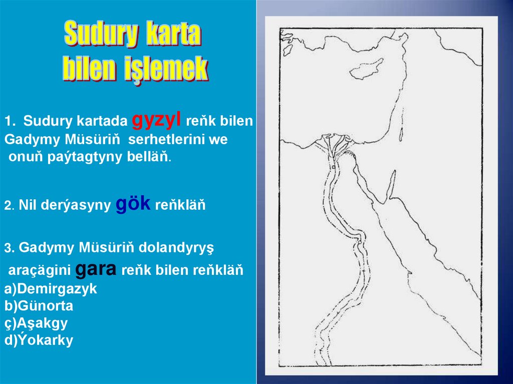 1. Sudury kartada gyzyl reňk bilenGadymy Müsüriň serhetlerini we