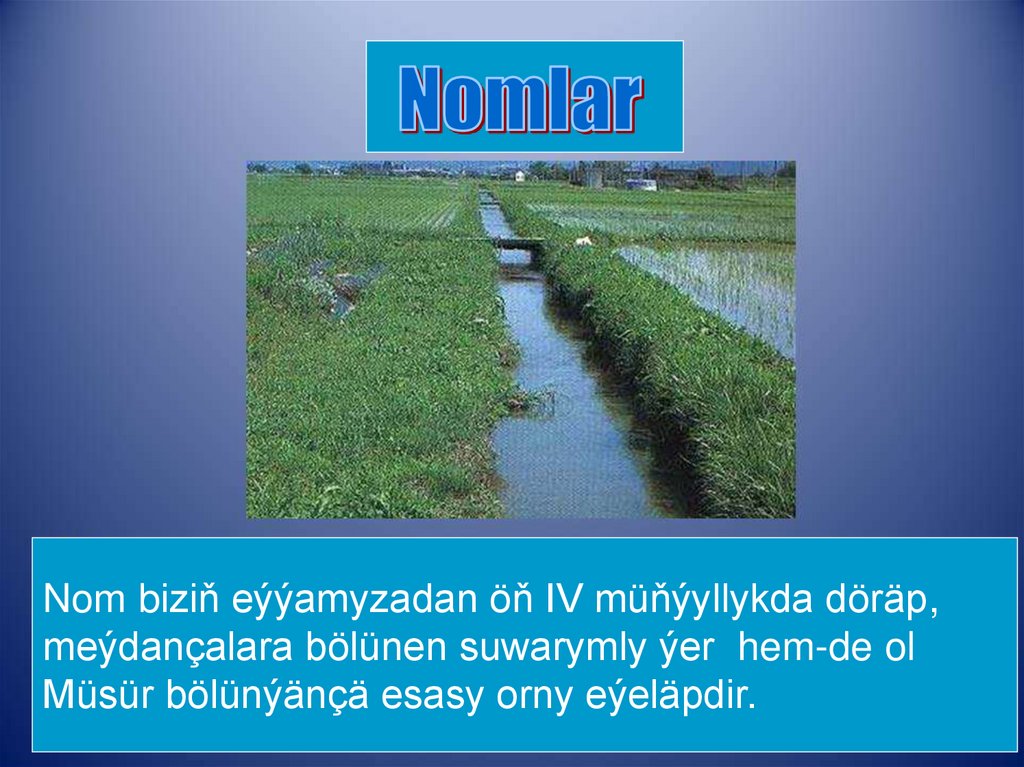 Nom biziň eýýamyzadan öň IV müňýyllykda döräp,meýdançalara bölünen suwarymly ýer hem-de ol