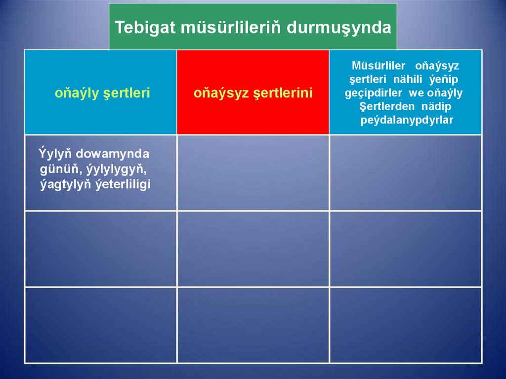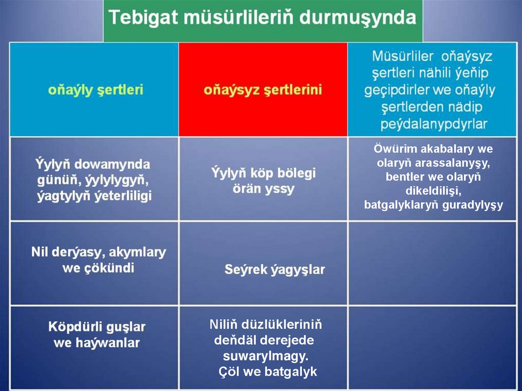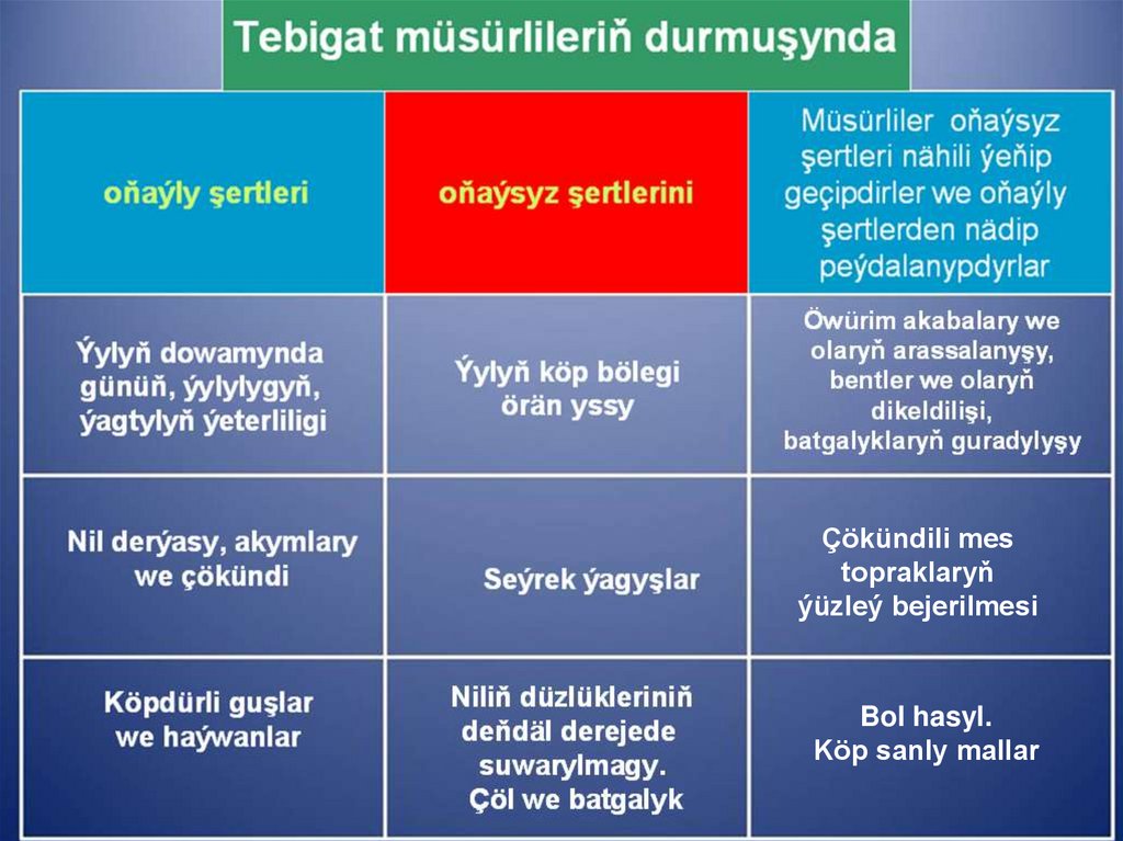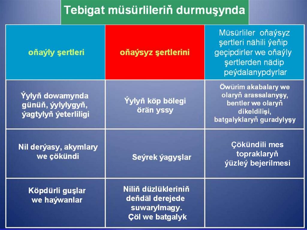 Tebigat müsürlileriň durmuşyndaoňaýly şertleri