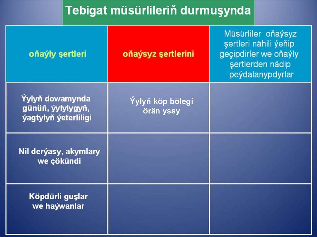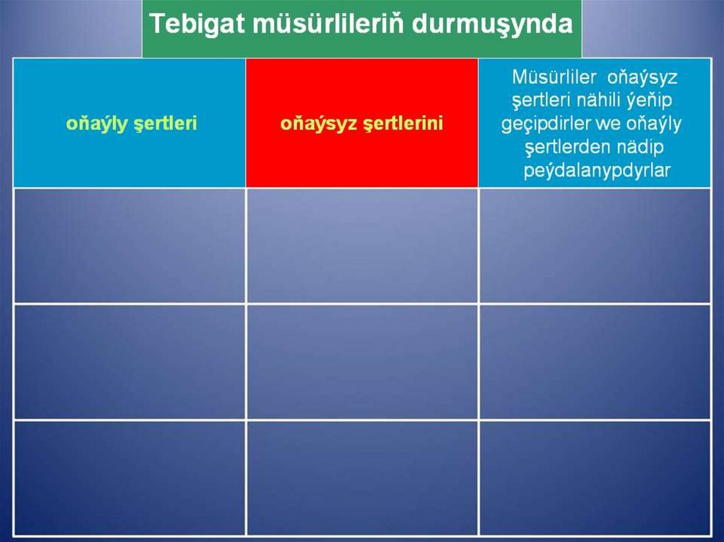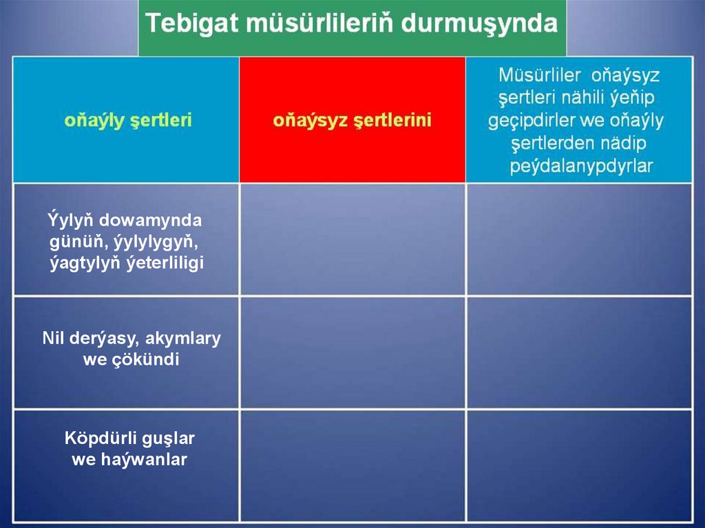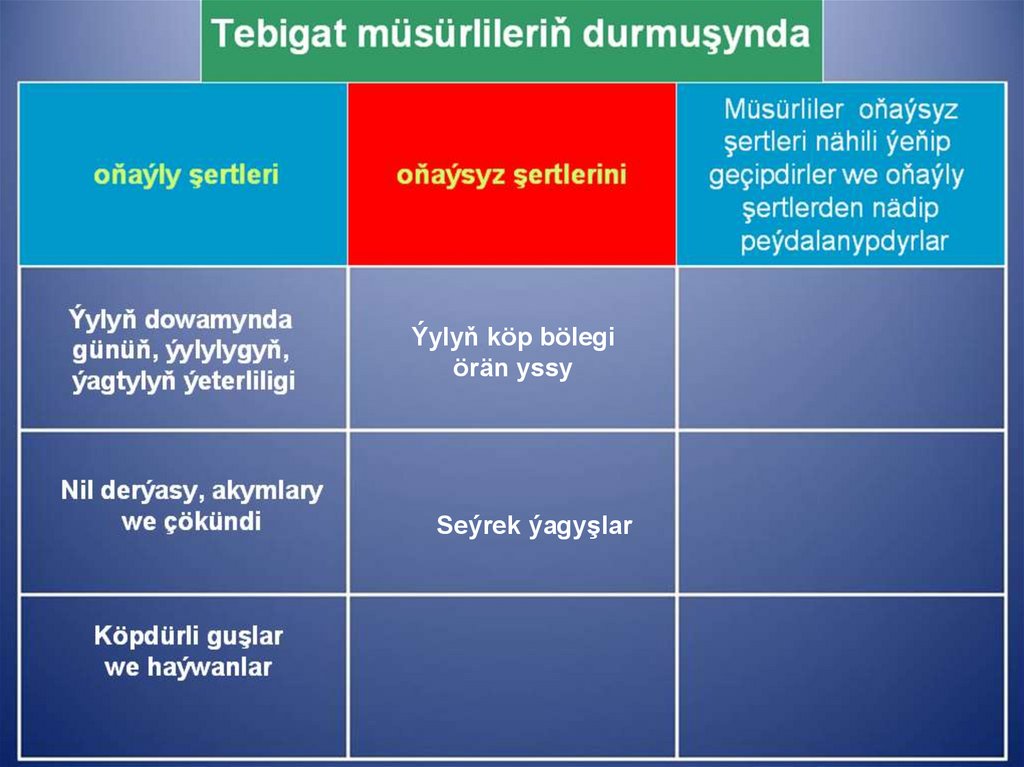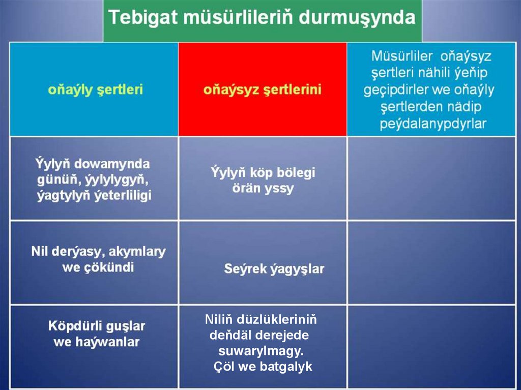 Tebigat müsürlileriň durmuşyndaoňaýly şertleri