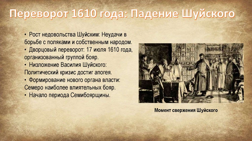 • Рост недовольства Шуйским: Неудачи вборьбе с поляками и собственным народом.