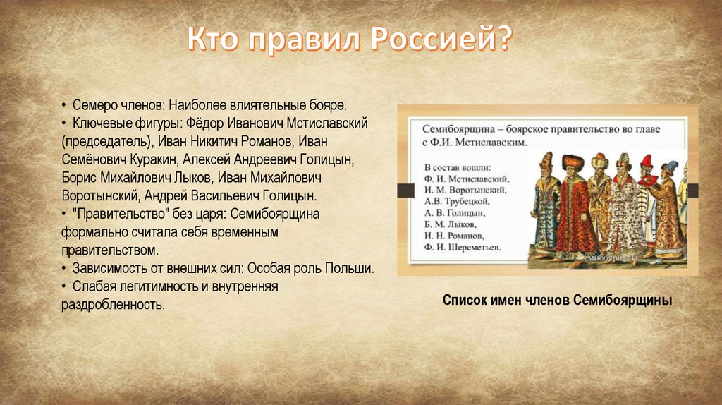 • Семеро членов: Наиболее влиятельные бояре.• Ключевые фигуры: Фёдор Иванович Мстиславский