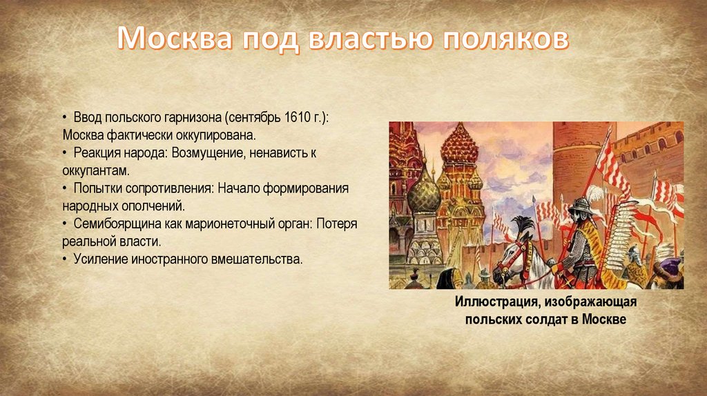 • Ввод польского гарнизона (сентябрь 1610 г.):Москва фактически оккупирована.