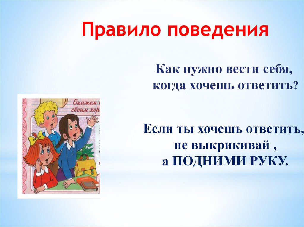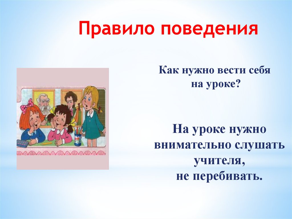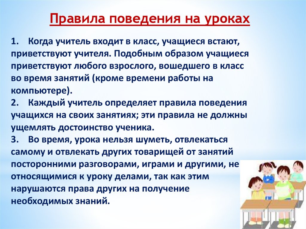 Правила поведения на уроках1. Когда учитель входит в класс, учащиеся встают,