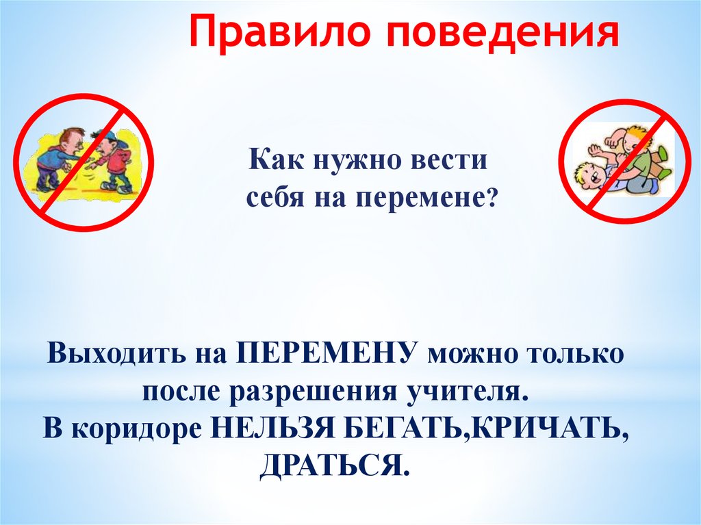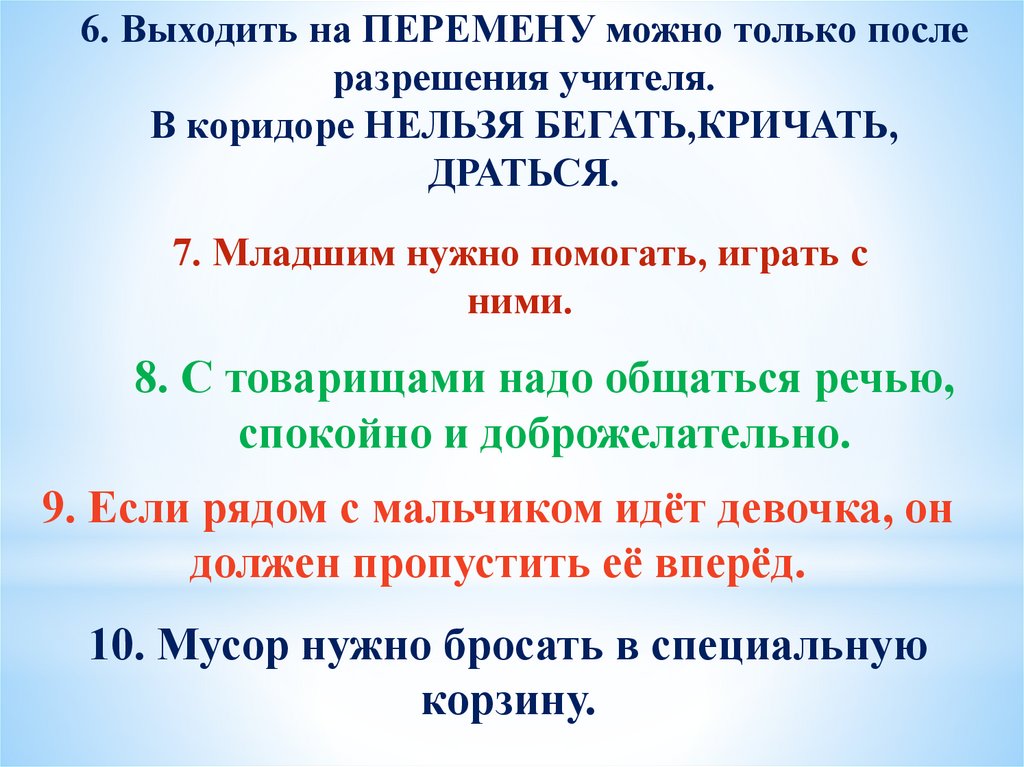 6. Выходить на ПЕРЕМЕНУ можно только послеразрешения учителя.