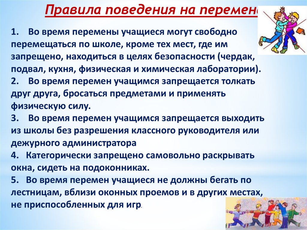 Правила поведения на переменах1. Во время перемены учащиеся могут свободно