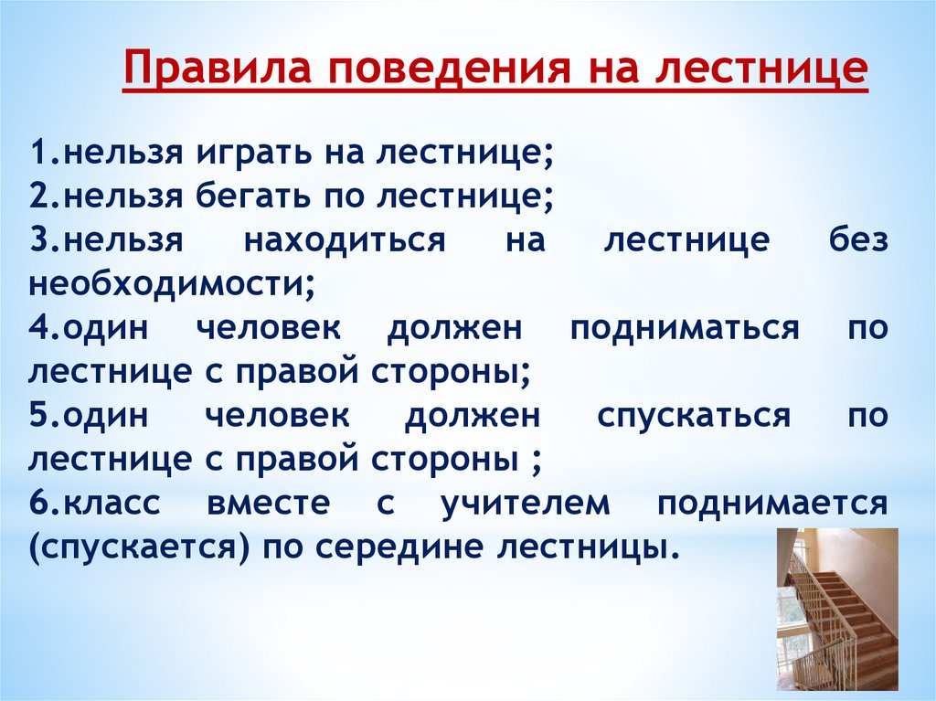 Правила поведения на лестнице1.нельзя играть на лестнице;