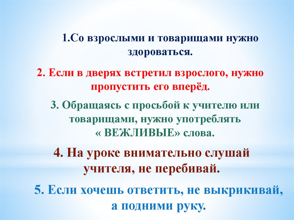 1.Со взрослыми и товарищами нужноздороваться.