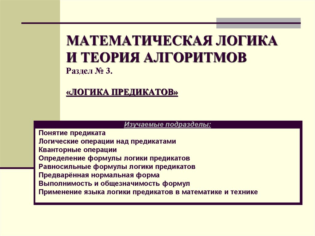 1. МАТЕМАТИЧЕСКАЯ ЛОГИКА И ТЕОРИЯ АЛГОРИТМОВ Раздел № 3. «ЛОГИКА ПРЕДИКАТОВ»
