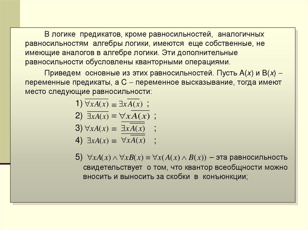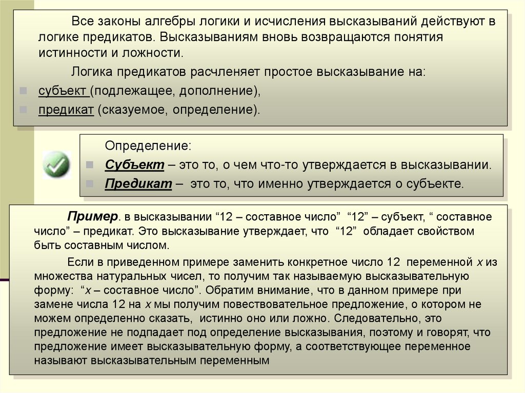 Все законы алгебры логики и исчисления высказываний действуют влогике предикатов. Высказываниям вновь возвращаются понятия