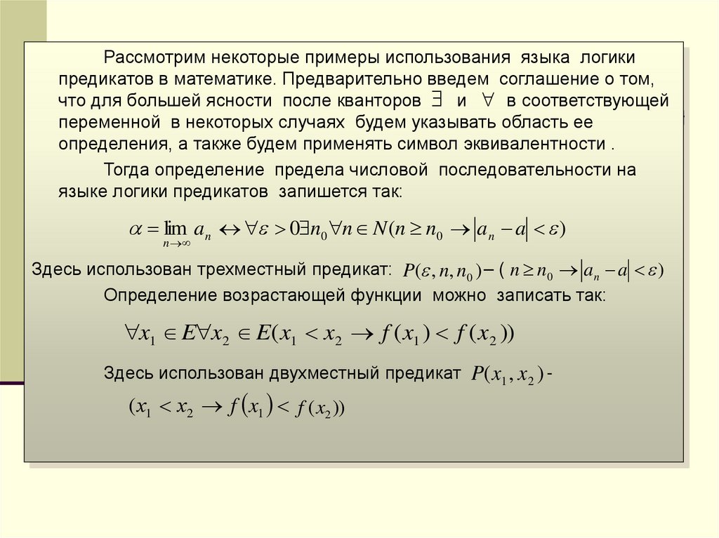 Рассмотрим некоторые примеры использования языка логикипредикатов в математике. Предварительно введем соглашение о том,