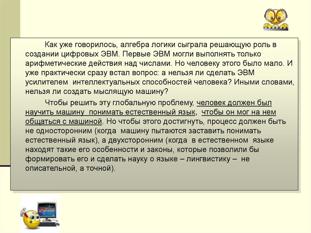 Как уже говорилось, алгебра логики сыграла решающую роль всоздании цифровых ЭВМ. Первые ЭВМ могли выполнять только