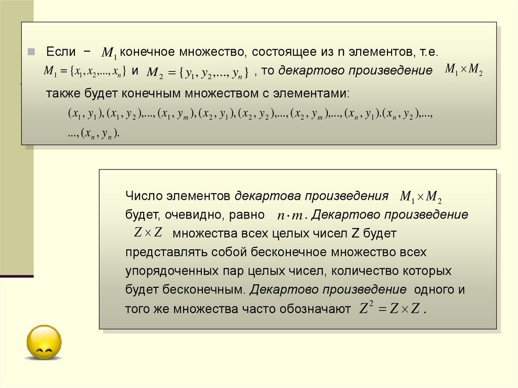 M1 {x1, x2 ,..., xn } и M 2 { y1 , y2 ,..., yn } , то декартово произведение M1 M 2