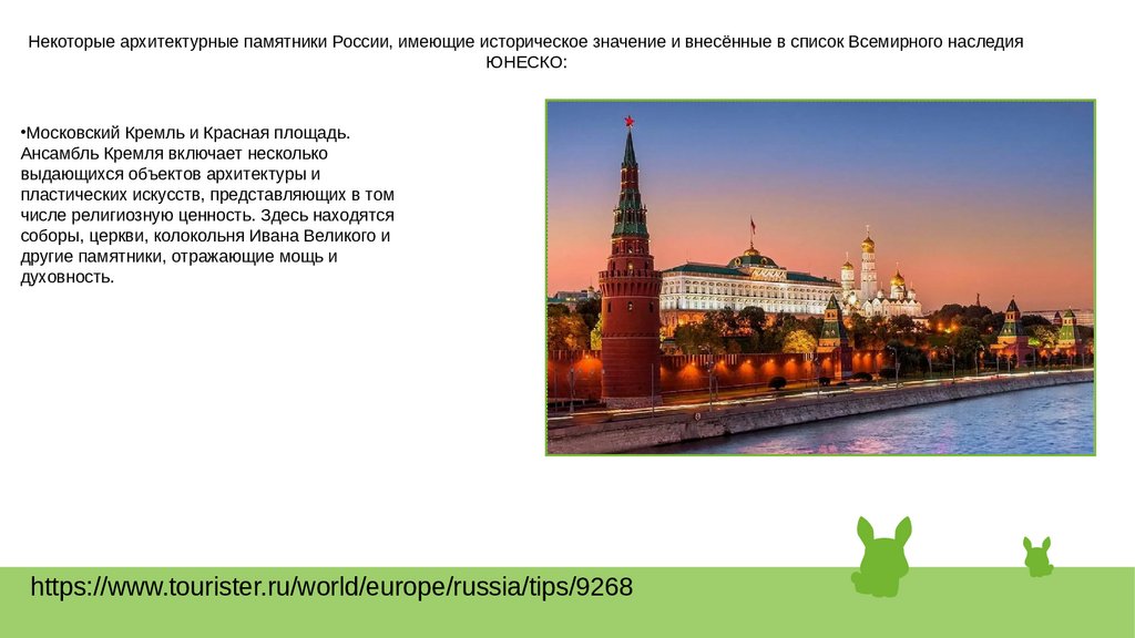 Некоторые архитектурные памятники России, имеющие историческое значение и внесённые в список Всемирного наследияЮНЕСКО: