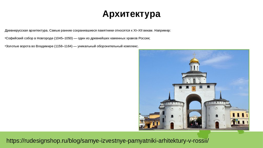 АрхитектураДревнерусская архитектура. Самые ранние сохранившиеся памятники относятся к XI–XII векам. Например: